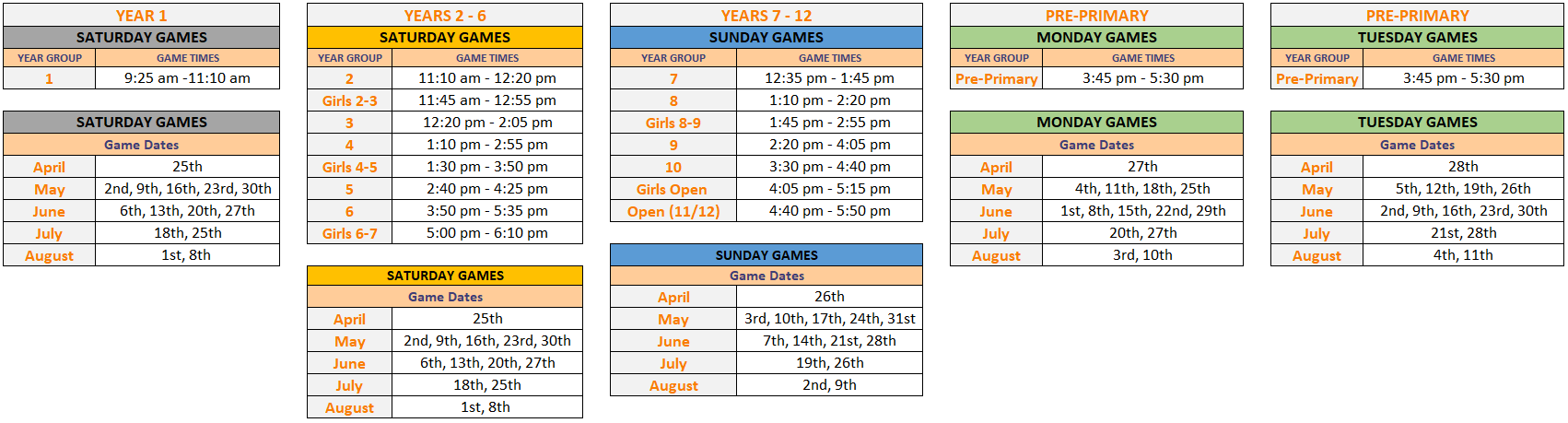 The Year 1 grade has been moved to Saturday morning for the Winter Season, please be aware this will change back to Sunday morning for the Spring season.